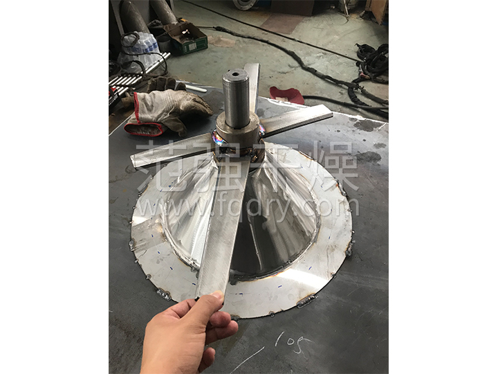 熱空氣切線(xiàn)進(jìn)入干燥器底部,在攪拌器帶動(dòng)下形成強有力的旋轉風(fēng)場(chǎng)。膏狀物料由螺旋加料器進(jìn)入干燥器內,在高速旋轉攪拌槳的強烈作用下,物料受撞擊、磨擦及剪切力的作用下得到分散,塊狀物料迅速粉碎,與熱空氣充分接觸、受熱、干燥。脫水后的干物料隨熱氣流上升,分級環(huán)將大顆粒截留,小顆粒從環(huán)中心排出干燥器外,由旋風(fēng)分離器和除塵器回收,未干透或大塊物料受離心力作用甩向器壁,重新落到底部被粉碎干燥。