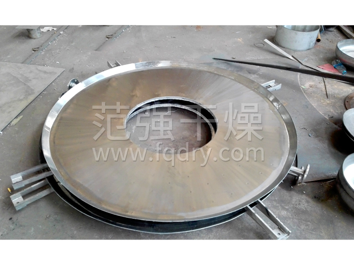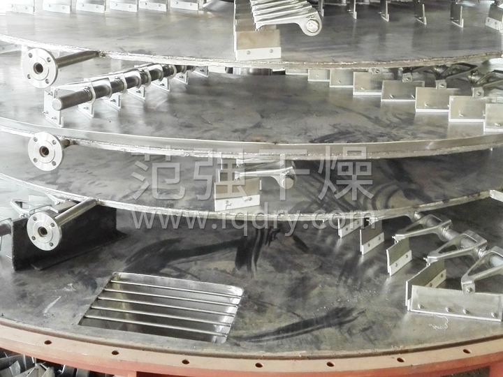 濕物料自加料器連續地加到盤(pán)式連續干燥機上部第一層干燥盤(pán)上,帶有耙葉的耙臂作回轉運動(dòng)使耙臂作回轉運動(dòng)使耙葉連續地翻抄物料。物料沿指數螺旋線(xiàn)流過(guò)干燥盤(pán)表面,在小干燥盤(pán)上的物料被移送到外緣,并在外緣落到下方的大干燥盤(pán)外緣,在大干盤(pán)上物料向里移動(dòng)并從中間落料口落如下一層小干燥盤(pán)中。大小干燥盤(pán)上下交替排列,物料得以連續地流過(guò)整個(gè)干燥器。中空的干燥盤(pán)內通入加熱介質(zhì),加熱介質(zhì)形式有飽和蒸汽、熱水和導熱油,加熱介質(zhì)由干燥盤(pán)的一端進(jìn)入,從另一端導出。已干物料從底層干燥盤(pán)落到殼體的底層,而后被耙葉移送到出料口排出。濕份從物料中逸出,由設在頂蓋上的排濕口排出,真空型盤(pán)式干燥機的濕氣由設在頂蓋上的真空泵口排出。從底層排出的干物料可直接包裝。通過(guò)配加翅片加熱器、溶劑回收冷凝器、袋式除塵器、干料返混機構、引風(fēng)機等輔機,可提高其干燥的生產(chǎn)能力,干燥膏糊狀和熱敏性物 料,可方便地回收溶劑,并能進(jìn)行熱解和反應操作。