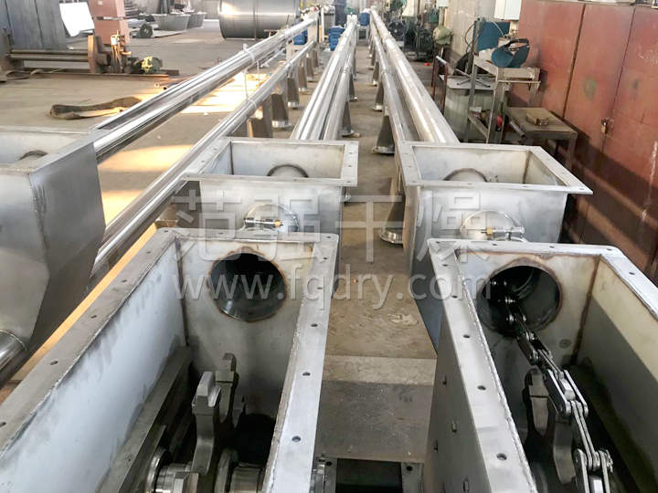 驅動(dòng)鏈輪帶動(dòng)鏈板,按規定方向在封閉輸送管內循環(huán)轉動(dòng),物料從進(jìn)料口進(jìn)入后,被移動(dòng)的鏈板推動(dòng)一直到出料口,由于重力的作用,物料下落到出料口排出。由于減速機連續不間斷運轉,物料也就從一點(diǎn)連續被送到另一點(diǎn),形成連續料流。